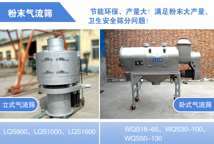 粉末气流筛有立式和卧式两种,立式气流筛的型号有:LQS600、LQS1000、LQS1600;卧式气流筛的型号有:WQS18-65、WQS30-100、WQS50-130,用材质有不锈钢和碳钢(可根据用户的要求特殊定制)