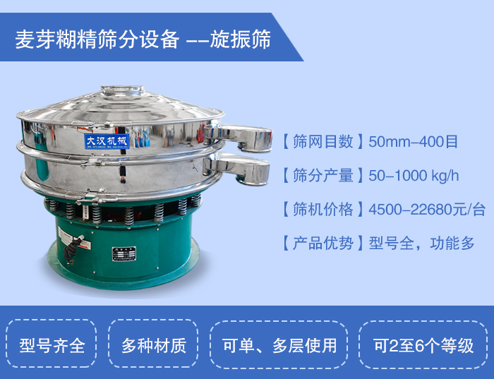麦芽糊精使用的旋振筛型号有:DH-400、DH-600、DH-800、DH-1000、DH-1200、DH-1500、DH-1800、DH-2000等八种标准机型。不同的型号就有不同的筛分处理量,可达每小时1吨。