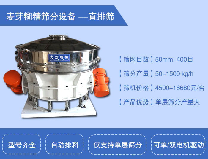 直排筛的型号与旋振筛型号相同,在层数上仅支持单层筛分,所以主要用于麦芽糊精简单过滤和除杂,有单电机和双电机两种驱动方式(一般选择双电机形式),使麦芽糊精在筛面上产生涡旋运动,具有自动排料功能,可24小时连续自动化生产;主要用于粉体生产线工艺流程中的粉体的除杂,筛分作用。