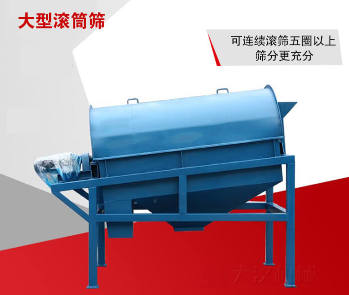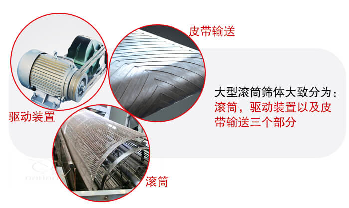 大型滚筒筛体大致分为:滚筒,驱动装置以及皮带输送三个部分,产品的结构比较简单,维修方便。