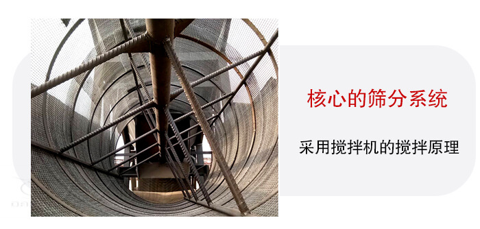 其核心的筛分系统采用搅拌机的搅拌原理,原料在搅拌筒内受连续螺旋叶片翻滚、推挤及物料间相互磨擦作用,作用强烈可靠性高。