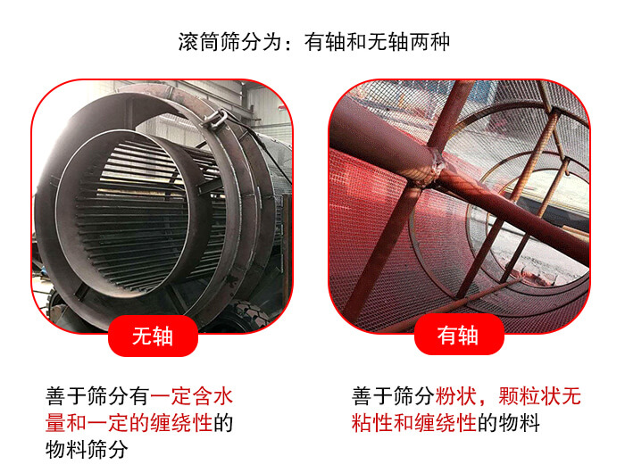 2,根据所筛分的物料选择不同结构的产品,对于滚筒筛大致能够分为:有轴和无轴两种,有轴的善于筛分粉状,颗粒状无粘性和缠绕性的物料。无轴的则是和一些有一定含水量和一定的缠绕性的物料筛分。