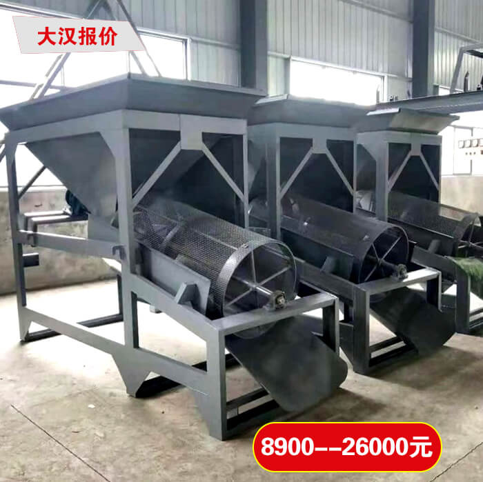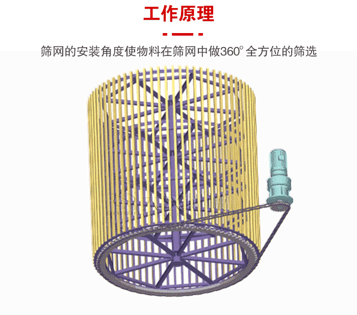 物料从料斗进入滚筛中,经过筛网网孔大小的筛选以及电机带动轴承于筛网的滚筒,能够保证物料在筛网中做360°全方位的筛选,同时经过筛网选出的物料就会,经皮带输送机,输送到固定的沙堆或者直接装车运走,没有筛出的物料就会随筛筒滚动到筛尾,从废料口流出。