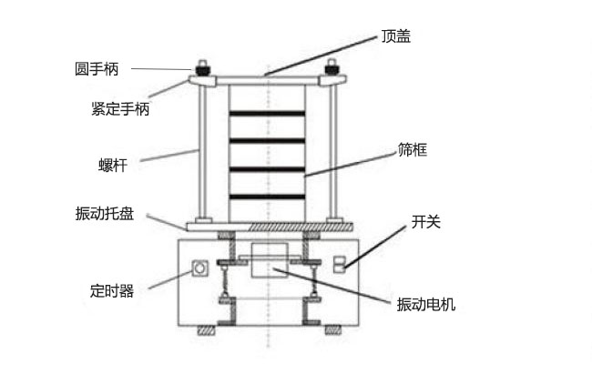 检验筛主是以立式振动电机作为整个电机的激振源,通过振动电机带动上部振动盘振动,再通过振动盘传导至安放在振动盘上部的筛框上,然后由需要检测目数的筛框把小于筛网口孔径的物料颗粒筛分至下层筛框,如此层层筛选,使每一层检验筛内只留相同粒度的物料,达到不同粒度的分离并确定此物料的粒度组成,使筛框中的物料能够达到非常有效的过滤,分级,筛分的目的。