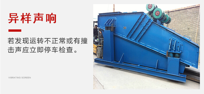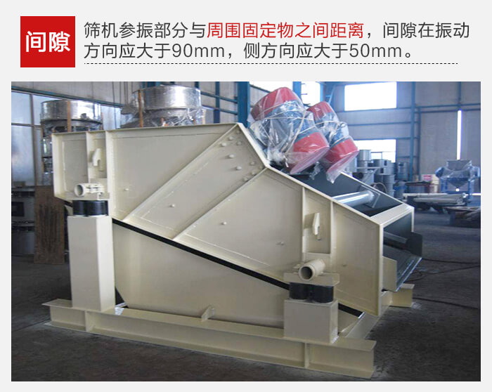 筛机各部分连接必须牢固可靠,所有螺栓不得有松动。筛机上参振部分与周围固定物之间的间隙在振动方向应大于90mm,在侧方向应大于50mm.