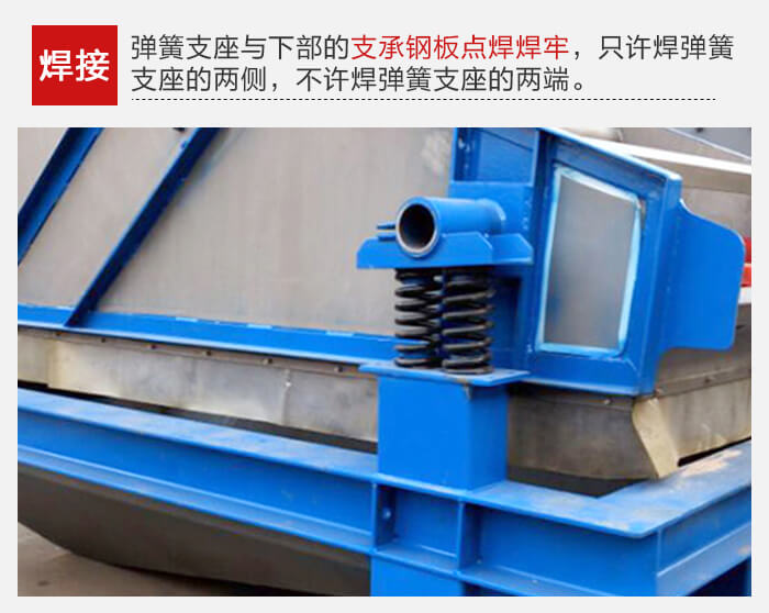 振动器各部分安装完毕,调整好相对位置,各处的一次、二次隔振动弹簧均呈垂直状态后,把弹簧支座与下部的支承钢板点焊焊牢。焊接时,只许焊弹簧支座的两侧,不许焊弹簧支座的两端。